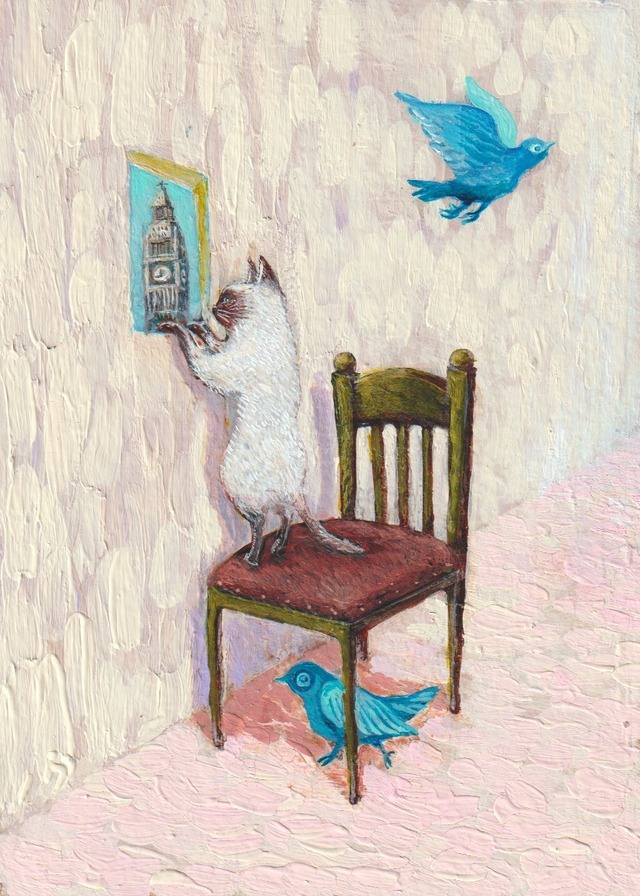 作家: 絵描きノグチヒロシ アクリル水彩絵画作品2024年8月製作 「今、何時なのか知りたいだけなのに 青い鳥はそれが気に食わないようだ。」 サイズ:ヨコ27cm-タテ33cm-厚2cm